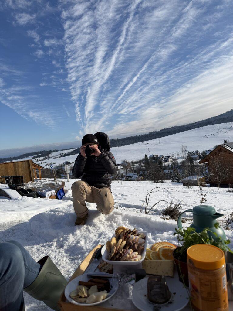 De eerste shoot is koffiedrinken in de sneeuw. We voelen de zon die in deze tijd van het jaar veel krachtiger wordt. Ondanks dat er geen koffie meer in onze koppen zit kunnen we in elk geval van het uitzicht genieten. Daarnaast zie ik ook de ontspannen en lachende Maciek langzaam veranderen in de professional van fotograaf en filmer. De Drone hangt in de lucht en wordt afgewisseld met de camera. Ik kan genieten van zoveel passie en weet zeker dat we die ook in de foto’s en films terug gaan zien. Dan is het tijd voor de kledingwissel. Eke en ik rennen door de sneeuw naar beneden en wanneer we even later in badkleding weer buiten komen rennen we nog sneller. Helaas wil onze fotograaf een shoot dat we ontspannen naar boven lopen. Nu is dat bijna 100 meter door de sneeuw en bij minus 5 graden, maar ja de professional beslist. En dus lopen we schijnbaar ontspannen kletsend naar boven. Dan mogen wij gelukkig in het warme water gaan zitten.