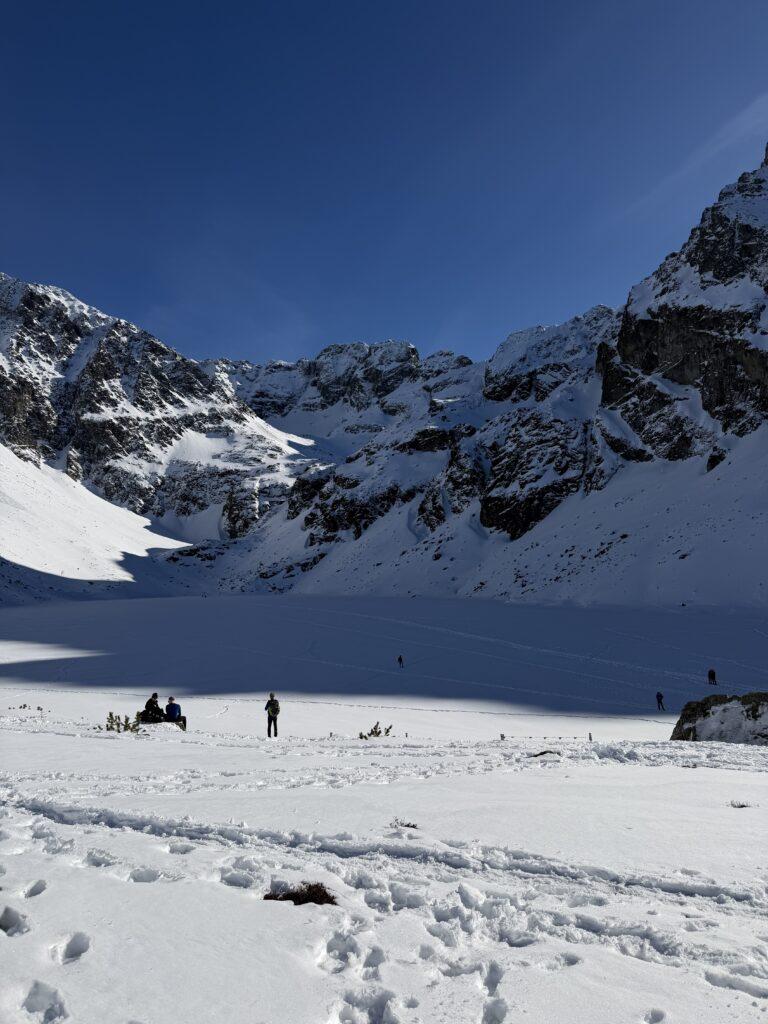 De volgende ochtend gaat vroeg de wekker. We vertrekken naar de Tatra bergen. Op zoek naar een mooi meer. In deze tijd van het jaar is het altijd checken of de route veilig genoeg is. vorig jaar nog moesten we met gasten besluiten om terug te gaan. Dit geldt zeker voor de laatste 30 minuten naar het meer. Fingers crossed dus. Ondertussen is onze tocht gestart. Al snel moeten we de stijgijzers onder onze schoenen doen. De punten doen uitstekend werk en zorgen voor stabiliteit en veiligheid in de sneeuw en het ijs op ons pad. De gewilde strakblauwe lucht en perfecte sneeuwcondities doen de rest. Gestaag lopen we het stijle pad omhoog. We zorgen voor voldoende rustpauzes. Natuurlijk op de mooiste uitzicht plekken. Wanneer we boven in de vallei aankomen gaan we lunchen. Een heerlijk broodje gezond met winterthee is op deze plek een waar feestmaal.
