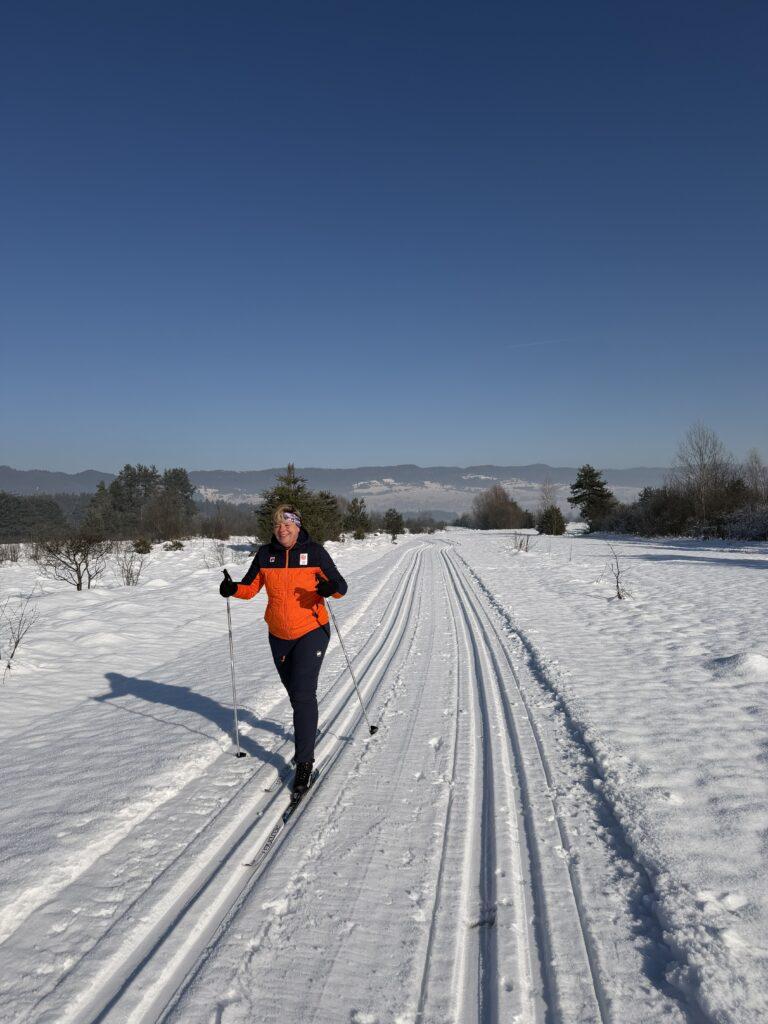 De volgende dagen kiezen we keer op keer een andere route en plek. Dit maakt dat we steeds meer de techniek onder de knie beginnen te krijgen en dus ook meer kunnen genieten. Net als in Nederland elk dorp in de winter een ijsbaan heeft. Hebben de meeste dorpen hier in de regio een piste of een langlaufroute. Door deze plekken af te wisselen hebben we keer op keer een nieuwe omgeving. Na een paar dagen begint de spierpijn toch te komen. Het herinnert mij aan de tijd van ouderwetse winters. Na 2 weken elke dag tochten op het ijs snakte je na een dag rust. Stilletjes hoopte je op een dag dooi waarin je niet kon schaatsen. Dan konden je spieren zich weer even opladen. Zo is het nu ook hier. Het is een ongewone beweging met spieren op plekken waarvan je het bestaan niet wist. Gelukkig zwemmen we 2 keer per week en dit blijkt ook uitstekend tegen de spierpijn te werken. Zo kunnen we de volgende dag gewoon weer een mooie route uitzoeken.